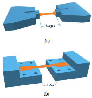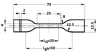 Figure 3 shows sketches of the specimen mounted on the grip-heads. The INSTROM 33961 and CIMTA-MEP02 machines have the same mounting scheme. On the other hand, PASCO ME8230 has grips to hold the bone-shaped end of the specimen. This choice was not awkward, taking into account that the measurement of displacements and strains in all of these machines is based on the difference of distance between grips, an aspect accepted in absence of extensometers, and employed in much of the aforementioned research. Thus, the specimen mounted on the PASCO machine has LGL gh .