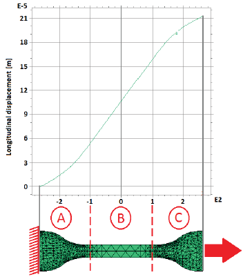 In order to help the understanding of this topic, a 3D finite element analysis, performed in FlexPDE® (Backstrom, 2006), is shown in Figure 4, where, it is possible to see the variation of the longitudinal displacement in the axis line of an ISO 527/2-5A specimen under a given extensional tension, according to the typical mounting (in absence of an extensometer) of INSTROM 33691 and CIMTA-MEP02 machines.