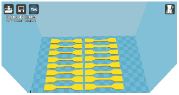 The printing parameters of each set of specimens are shown in Table 2. They correspond to the optimal configurations given or suggested by printer and filament manufacturers, given that they correspond to a machine of Argentinian origin: Far-TecnoART®, which has a nozzle diameter of 0,35 mm and uses 1,75 mm filaments. All of the latter were acquired from the same manufacturer. The whole set of 16 specimens for each material was constructed simultaneously in a multiple part printing process (Figure 5). The CURA V15.04 software was used for slicing and creating the gcode.