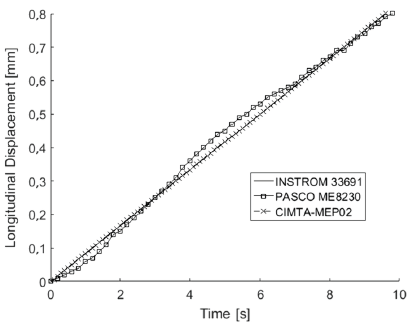As it is possible to see, the paths of INSTROM 33691 and CIMTA-MEP02 are lines (i.e. motion of uniform speed set in 5 mm/min = 0,0833 mm/s), whereas a variable behavior is observed in the case of PASCO ME8230, which oscillates along the aforementioned linear path. This behavior is consistent with the manual handling of the machine, and special attention was given to the rotation pace of the crank in order to maintain the speed of the machine head as close as 5 mm/min (this was controlled by means of the Capstone software that interfaces the PC and test machine).