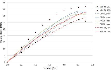 Figure 7 shows the maximum and minimum stress-strain experimental envelope curves of the CPLA tested with the three machines. The present results are compared with the experimental data gathered from the research by Jain and Tadesse (2019), who evaluated the response of their version of carbon conductive PLA (or CPLA) with respect to the percentage of conductive carbon incorporated to plain PLA. As mentioned before, the CPLA employed in the present research is generic (and not completely detailed by its manufacturer). It is possible to see that the present results are contained between the limit cases of the experimental data offered by Jain and Tadesse (2019).
