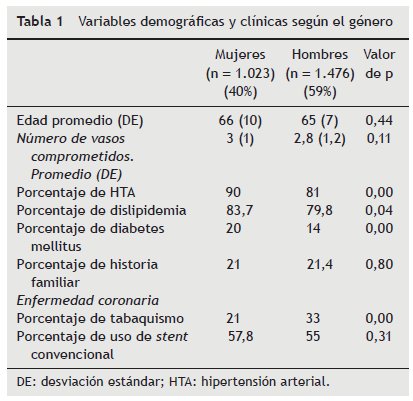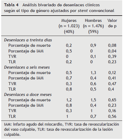 Se incluyeron 2.499 pacientes, 41% de sexo femenino, con edad promedio de 66 años, sin diferencias según el género. La distribución de los factores de riesgo por sexo se describe en la tabla 1. Para la población de mujeres se encontró mayor frecuencia de comorbilidades como hipertensión y diabetes. No se encontraron diferencias significativas respecto al uso de stents convencionales (57,8% en las mujeres y 55% en los hombres p = 0,31). Al comparar los desenlaces de muerte, revascularización repetida del vaso y de la lesión culpable e infarto para toda la población del estudio, independiente del tipo de stent utilizado, se observó que la tasa de revascularización repetida de la lesión culpable fue mayor a treinta días y a seis meses en las mujeres; esta diferencia, no obstante, dejó de ser significativa al año de seguimiento (tabla 2). El subgrupo de mujeres diabéticas mostró igual comportamiento que el de los hombres diabéticos. El análisis bivariado según el tipo de stent mostró que los desenlaces clínicos son similares para hombres y mujeres revascularizados con stents medicados (tabla 3); pese a ello se apreció mayor incidencia de infarto a treinta días en las mujeres revascularizadas con stents convencionales (tabla 4).