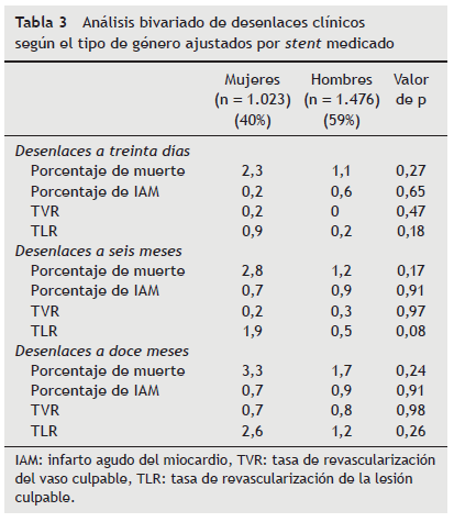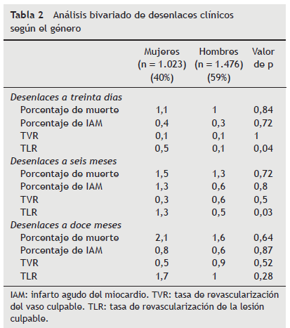 Se definieron como desenlaces: presencia de infarto agudo del miocardio (IAM), necesidad de revascularización del vaso culpable (TVR), requerimiento de revascularización de la lesión previamente tratada (TLR) y muerte. Éstos se analizaron por separado para cada uno de los géneros, en el primero, sexto y décimosegundo mes de seguimiento. El análisis estadístico se realizó mediante SPSS v20; todas las variables cualitativas se presentan con frecuencias relativas y las cuantitativas se describen mediante medidas de tendencia central.