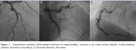 La angina de pecho puede reflejar el estado avanzado de la enfermedad coronaria en la que el flujo de reserva coronario es insuficiente para la demanda metabólica del miocardio. Algunas características anatómicas que impiden el manejo quirúrgico son cada vez más frecuentes, por ejemplo, la presencia de enfermedad coronaria severa y difusa -como el caso que aquí se reporta-, miocardio dependiente de colaterales, múltiples reestenosis coronarias, oclusiones crónicas totales, degeneración de injerto de la vena safena, o ausencia de conductos debido a bypass coronario previo. Las comorbilidades significativas también pueden excluir la posibilidad de revascularización miocárdica en algunos pacientes. Por esto, para el equipo multidisciplinario encargado del cuidado de la angina refractaria es importante estar familiarizado con este diagnóstico y dirigir la terapia basada en los avances disponibles para su manejo2.