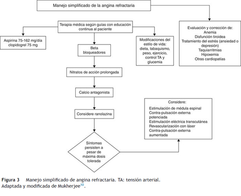 Así pues, el tratamiento de la angina refractaria está basado en la evidencia de las guías de práctica clínica (fig. 3) que recomiendan un manejo integral que incluya la modificación de factores de riesgo, el uso de medicamentos antianginosos y la consideración de tratamientos alternativos como la neuroestimulación de médula espinal, la contrapulsación externa potenciada (enhanced external counterpulsation {EECP}), la estimulación nerviosa eléctrica transcutánea, la revascularización con láser o incluso la angiogénesis miocárdica con terapia de células madre o génica. Estas terapias novedosas continúan en investigación y precisan de comparación en estudios clínicos aleatorizados9,10.