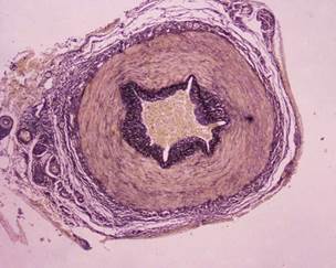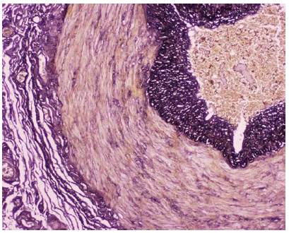 Figura 2 Corte histológico de la biopsia de la arteria temporal, con evidencia de hiperplasia miointimal, contorno irregular y displasia fibromuscular. Tinción de Van-Gieson.