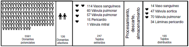 Desde 2014 hasta 2016 fueron reconocidos por todos los bancos de tejidos del país y por otras instituciones coadyuvantes un total de 5.561 donantes potenciales, cifra que, que después de ser sometidos a evaluación, se redujo a 126 donantes efectivos para tejido cardiovascular (en promedio 42 por año) que corresponden al 2,3% de los evaluados. De estos donantes se obtuvieron 247 tejidos (en promedio 82 tejidos por año; 2 tejidos por donante efectivo durante el periodo) entre válvulas cardiacas, pericardio y vasos sanguíneos. Finalmente, se distribuyeron 165 tejidos en los tres años (en promedio 55 tejidos por año).