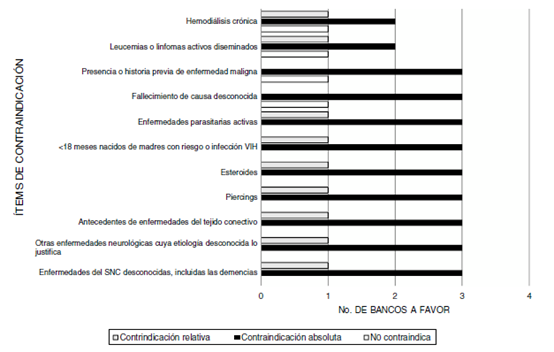 En la figura 3 se halla la relación de contraindicaciones en que no hay coincidencia, referida por los bancos. Otras contraindicaciones importantes que no fueron evaluadas por la encuesta, pero que los Bancos consideran importantes son: