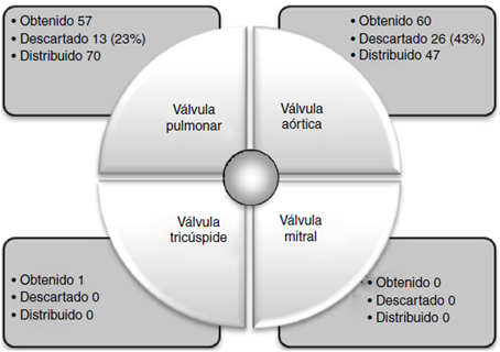 El promedio de descarte también tiene una diferencia evidente; el porcentaje de este en España es aproximadamente del 25% por cuestiones de calidad. La principal estructura descartada es la válvula pulmonar, y la mayoría de veces se debe a problemas en la disección (morfológicos y anatómicos) y a la contaminación durante el procesamiento3. En el ambiente local este porcentaje es mayor al 33% para válvulas cardiacas y en todo el tejido cardiovascular del 21%; sin embargo, las causas son las mismas.
