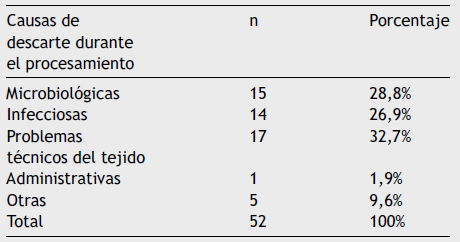 Al ser tan importante la condición de asepsia de los tejidos cardiovasculares, algunos bancos internacionales realizan múltiples evaluaciones de la esterilidad valvular en varios de los estadios del proceso (prelavado, lavado con soluciones estériles, solución de desinfección en diferentes tiempos)4. En los bancos colombianos, la segunda proporción más elevada de descarte durante el periodo se debió precisamente a análisis microbiológico alterado.