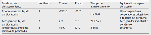 La relación de las condiciones de almacenamiento encontradas en los bancos colombianos se resume en la tabla 4. En relación con el pericardio, este se procesa con formaldehído y se almacena a temperatura ambiente durante máximo dos años.
