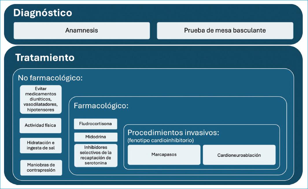 Después de un diagnóstico certero es fundamental brindar tranquilidad sobre la naturaleza benigna del síncope y fomentar medidas conductuales para eliminar o reducir los desencadenantes. Estas medidas incluyen explicar al paciente su enfermedad y evitar medicamentos diuréticos y vasodilatadores, que pueden agravar los síntomas. Entre los antihipertensivos, los alfabloqueadores, los nitratos, los betabloqueadores y los antagonistas del calcio presentan un mayor riesgo y deben ser descontinuados siempre que sea posible. Si se requiere medicación antihipertensiva, se deben preferir fármacos con efectos protectores o de bajo riesgo de hipotensión, como los inhibidores de la enzima convertidora de angiotensina o los antagonistas de receptor de angiotensina, administrados preferiblemente antes de acostarse. La mayoría de los medicamentos psicoactivos, incluidos la levodopa, los antipsicóticos, los antidepresivos tricíclicos, las benzodiazepinas, la trazodona y los opioides, pueden inducir hipotensión y agravar los síntomas3.