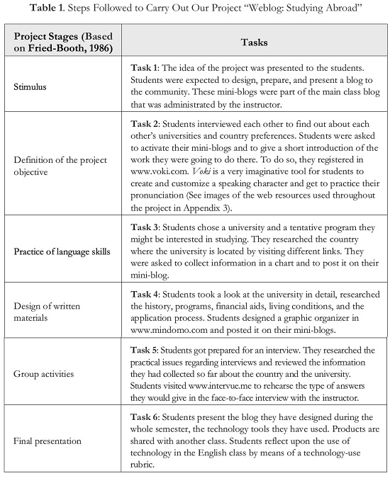A variety of technology-based activities was designed with the idea of accompanying students in the development of a project called "Weblog: Studying Abroad." At the very beginning of the project, the instructor had to explain in detail what the project was going to be about and its different stages. The project consisted of creating a blog and publishing information about one country where students would like to study, choosing a university and learning how to apply for a scholarship. Students were expected to design, prepare, and present a blog to the community.2 Table 1 shows the steps followed to carry out the project: