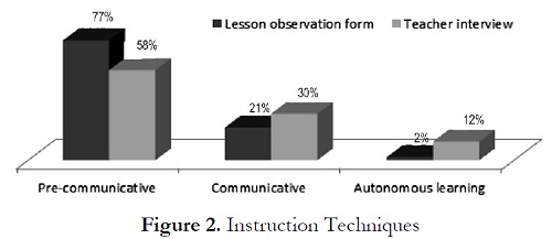 Figure 2 reveals that in a total of 72 English lessons observed, 77% of the instructional activities used by the English teachers were pre-communicative, 21% were communicative, and only 2% were based on autonomous learning. In the interview, these English teachers had admitted practing these activies with different percentages of occurrence, pre-communicative at 58%, communicative at 30%, and autonomous learning at 12%.