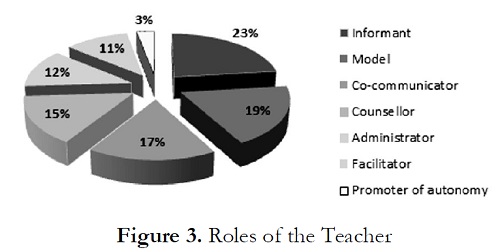 As shown in Figure 3, the English teachers played diverse roles in the 72 observed lessons. The pre-communicative roles of informant and model had 23% and 19% of occurrence, respectively. However, the communicative roles of co-communicator, counsellor, administrator, and facilitator had a thorough frequency of 55%. The role of promoter of autonomous learning had only 3%.