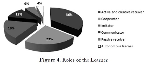 Figure 4 reflects the performance of diverse pre-communicative and communicative roles by the learners. The most frequent was the role of active and creative receptor with 36% of frequency. The second most observed role was that of being a collaborator with 23%. The role of imitator had a frequency of 19%. However, the role of communicator, that is, the one which is concerned with taking the initiative to spotaneously express one's feelings and opinions, had an occurrence of 12%. The least represented roles were the autonomous learner and the imitator with 4% and 6%, respectively.