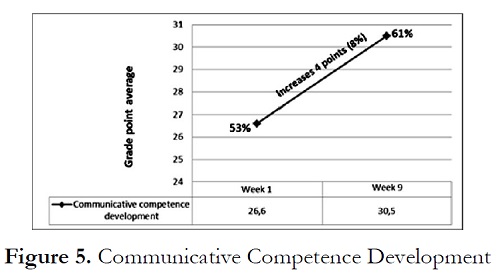 Figure 5 shows the average results students achieved on the pre-test and the post-test. On the first one they got a mean of 2.66 and on the second one a mean of 3.05, on a scale of 1 to 5. Even though there seems to be a slight amount of progress in these results, the difference does not turn out to be meaningful enough as to assert that the students have already acquired communicative competence in the target language.