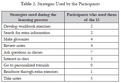 The analytical participants (5 of the 13) stated they learned best by analyzing, inferring, comparing, reflecting, and reviewing their notes. These skills were more predominant than others for them, so they preferred to analyze things to retain them better. This style was also evidenced through lessons when some of them showed to be critical and aware of their own weaknesses as English learners: "If I studied, I would achieve a better average"2 (Student 15). Moreover, three other participants expressed dissatisfaction with their average grades of previous English levels; they believed they could have improved their score in a substantial way and were conscious of this: