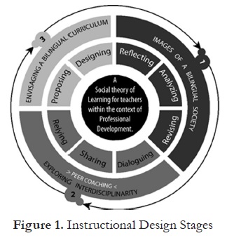 As seen in Figure 1, the stages of this pedagogical intervention elucidate a process of reflecting upon pedagogical and personal practices in regard to bilingualism and bilingual education. In this sense, the intention of this intervention was firstly, to make both EFL and self-contained teachers aware of this phenomenon, and secondly, to enact active participation in the development of a curriculum by addressing both learners' and teachers' needs. In doing so, teachers have an opportunity to empower themselves and others via sharing and discussing (Murray, 2010). In this sense, the first stage aimed at revising the conceptualization of the terms bilingualism and bilingual education to then analyze the way these notions have been institutionalized and assumed in our context. Listening and debating were key aspects to either shape or reject previous ideas. The second stage focused on endorsing participants' professional development by highlighting the practices of dialoguing and sharing personal and professional experiences so as to generate new ways of thinking about bilingual practices in Colombia.