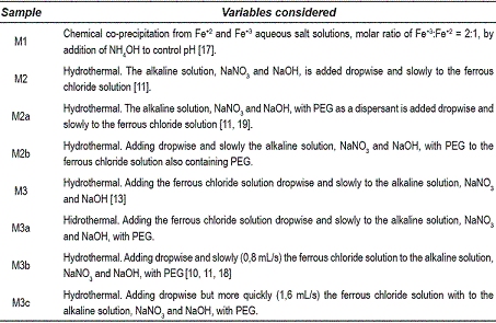 Three different methods of synthesis were evaluated, with some variations in each of them to finally obtain eight different magnetites. For a typical synthesis a degassed solution of ferrous chloride was added at a controlled rate to a degassed aqueous solution containing NaOH/ NaNO3. In other cases the addition was done in the other way around. In some cases polyethyleneglycol (PEG) was used as a dispersant to increase the viscosity of the system and evaluate its Stoichiometric quantities of the precursors were used and taken from the literature [7, 17]. Thus the precipitate obtained was decanted in a dialysis tubing cellulose membrane, and placed in a bath of distilled water. The anions of the suspension were removed by osmosis through the membrane. The water of the bath was replaced many times until the conductivity of the bath was constant and similar to the deionised water (0.054 μS Scm-1). The resulting was filtered and dried at 40oC for 48 hours. The prepared samples were stored in a desiccator under nitrogen atmosphere. All the used methods are described on Table 1. These are classified on three groups, group 1 (M1) corresponding to chemical coprecipitation from Fe2+ and Fe3+ , group 2 (M2, M2a y M2b), in which the oxidizing solution was added to the ferrous solution, and group 3 (M3, M3a, M3b, M3c) in which the ferrous solution was added to the oxidizing solution.