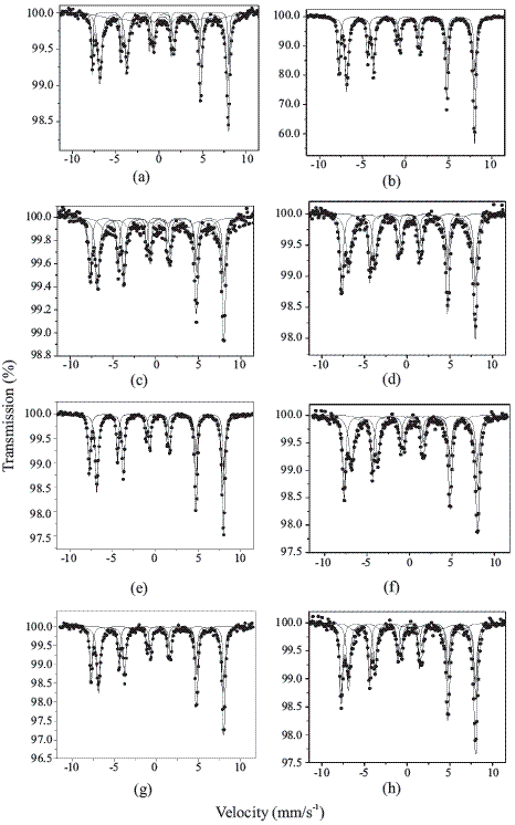 Figure 1 Room temperature Mössbauer spectra of synthetized magnetites. (a) M1, (b) M2, (c) M2a, (d) M2b, (e) M3, (f) M3a, (g) M3b, (h) M3c