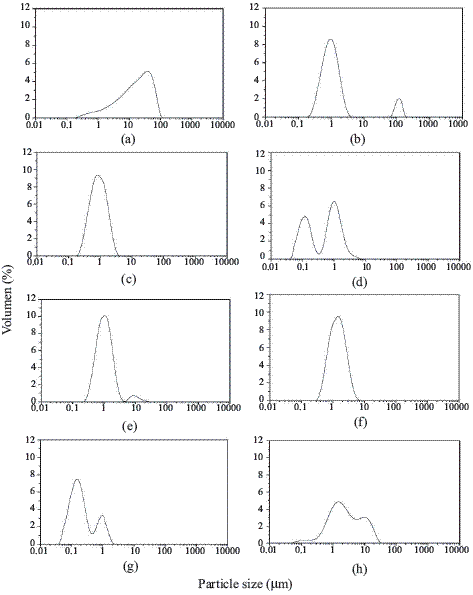 Figure 3 Particle size distribution. (a) M1, (b) M2, (c) M2a, (d) M2b, (e) M3, (f) M3a, (g) M3b, (h) M3c.