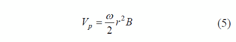 Una vez el imán comience a girar, inducirá una diferencia de potencial Vp entre el eje y la periferia de éste, con la misma polaridad que la de la fuente y que es función tanto del radio como de la velocidad de rotación (w), ecuación (5),
