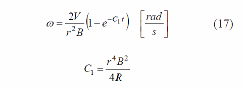 Al resolver esta ecuación diferencial teniendo la condición inicial igual a cero, se puede determinar la velocidad angular del motor en función del tiempo y si además se asume que el motor se diseña para que las pérdidas por fricción sean mínimas y para que opere con campos magnéticos grandes, es posible aproximar la velocidad angular a la ecuación (17),