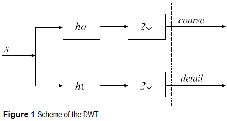 Since the detail of a signal is related to the high frequencies, the decimated-output of the high pass filter is known as the detail coefficients; in a similar way, since the approximation of a signal is related to the low frequencies, the decimated-output of the low pass filter is known as the coarse coefficients. Figure 1 illustrates the scheme in which x is the input signal, h0 is the low pass filter, h1 is the high pass filter and 2