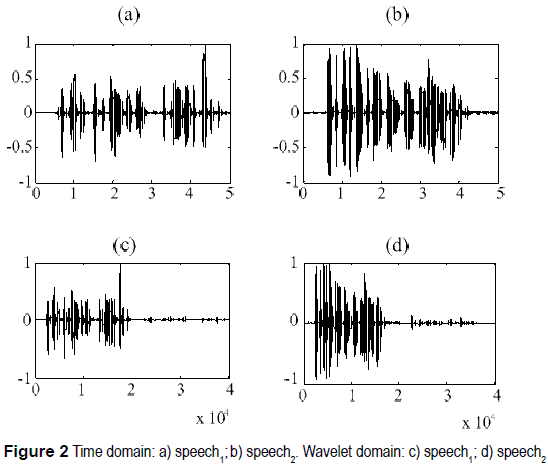 It can be easily illustrated with an example. Suppose there are two speech signals with different plaint-text, for example speech1 with the plain-text the purpose of this experimental test is to validate the hypothesis and speech2 with the plain-text el propósito de esta prueba experimental es validar la hipótesis. Both signals has the same sampling frequency (fs=8KHz), time-scale (t=5s), and are from a female speaker. Figure 2 shows the signals in time and wavelet domain.