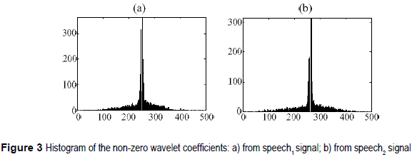 As it is expected, both time and wavelet representations are different in each case. Now, two non-zero arrays are made from the non-zero wavelet coefficients of speech1 and speech2. Since there are a lot coefficients with magnitude close to zero, a threshold (th) is set which classifies the zero or the non-zero wavelet coefficients. If the magnitude of the wavelet coefficient is lower than th, then the thresholded coefficient is set to zero, but if this is higher than th (or equal), the amplitude of the coefficient is preserved. Once the two non-zero arrays have been obtained, their histograms are calculated. Figure 3 shows the histograms of the non-zero wavelet coefficients of the two speech signals.