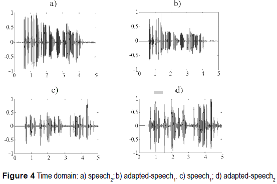 Now, the steps of the adaptation process presented in [11] are carried out to adapt a speech signal to another one. Firstly, speech1 is adapted so that it resembles speech2. Secondly, speech2 is adapted so that it resembles speech1. Figure 4 shows the original speech signals and the adapted speech signals. To measure the similarity between the target speech signal and the adapted-speech signal, we use the Squared Pearson Correlation Coefficient (SPCC) because it can be seen as a speech distortion index [17, 18]. If the value is zero it implies that the adapted-speech signal is not similar to the target speech signal, but if the value is (close to) one, the adapted-speech signal is highly similar to the target speech signal and therefore the hypothesis is true. In the first case of adaptation, the index of similarity is 0.98 and the ratio of the non-zero wavelet coefficients is 1.23; in the second case the index of similarity is 0.98 and ratio is 0.81. It is worth noting that ratio of the second case of adaptation is 1/ratio of the first case