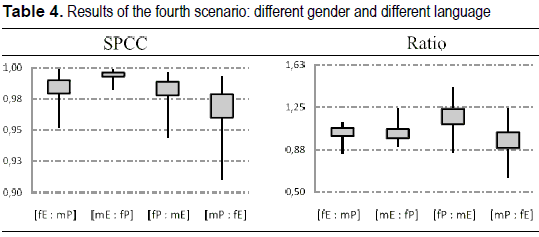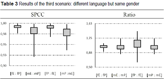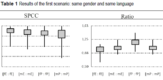 In tables 1-4 the results of the SPCC (first column) and the ratio of the non-zero wavelet coefficients (second column) are illustrated. There are 4 cases by scenario, each one with 25 tests, for a total by scenario of 100 tests. Every case is represented by its highest and lowest value, and the confidence interval of 95%. We use the following notation to name the scenario: the first and the second letter are related to the gender and the language of the original speech signal, respectively; while the third and the fourth letter are related to the gender and the language of the target speech signal, respectively. For example, the scenario [fP: mE] means that the original speech signal is from a female (f) speaker in Polish (P) language and the target speech signal is from a male (m) speaker in English (E) language.