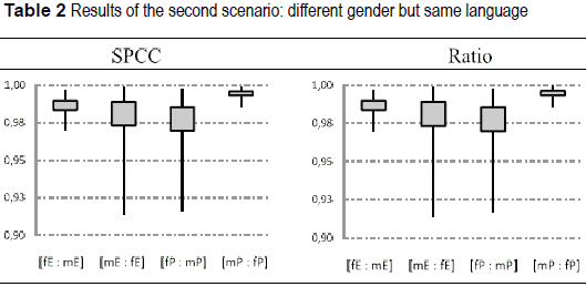 Now, we present the results by scenario. There are two measurements: the index of similarity, SPCC, and the ratio between the total nonzero wavelet coefficients of the speech signals (original and target). If ratio is 1, it means that the signals have the same number of non-zero wavelet coefficients, but if ratio is higher than 1 it means that the number of non-zero wavelet coefficients of the target speech signal is higher than the number of the non-zero wavelet coefficients of the original speech signal.