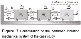 The robust and efficient performance of the proposed control approach was verified for the weakly damping vibrating mechanical system shown in Figure 3. Our case study considers unmodeled dynamics associated with the unknown secondary mechanical system (m3, c3, k3) perturbed as well. The mechanical system of three degrees of freedom is characterized by the set of parameters given in Table 1. Then, the natural frequencies of the mechanical system are computed as: ωn1 = 6.6854 rad/s, ωn2=17.361 rad/s and ωn3=35.174 rad/s.