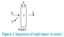 The light beam can be reflected from each one of the sides that it crosses with an intensity of Ir, can undergo absorption in the interior and, finally, can be transmitted with an intensity of Ir. The percentage absorbed depends on the thickness, b, and the characteristics of the mass that it is passing through. The Bouguer-Lambert-Beer law [14, 18]describes the trajectory shown in Figure 1 and defines the intensity of the light beam transmitted using Eq. (1).