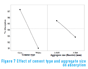 White cement mixed with a larger aggregate size (3.56 mm) produced the greatest losses due to reflection. The y-axis shows the value of the intensity of reflected light and the x-axis shows the types of cement that were used, according to their color, and the average size of the aggregates in mm. Since the white cement paste has a higher refractive index than the gray cement, as seen in Figure 4, the mortars with this cement have a greater intensity of reflected light. When the aggregate size is increased inside the mortars, this increases the possibility that the light beam impacting the mortar can hit fluorite and, since the fluorite has a higher refractive index than the pastes, this would explain why higher reflection would occur with larger aggregate sizes. The effect of cement type and aggregate size on the intensity of light absorption is seen in Figure 7.