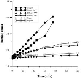 Data for the 20- and 50-hour PAV aging periods proved to be quite close to that observed for 8 and 11 years of field aging, respectively as shown in Figure 2.