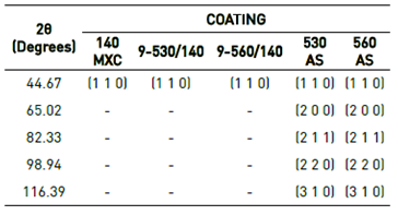 Table 1 Crystallographic planes and positions found by XRD in coatings 140MXC, 9- 530/140, 9-560/140, 530AS and 560AS