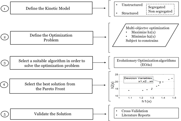 It is recommended to use a first-principles-based semi-physical model. The kinetic model should be selected taking into account the level of detail in the description of the phenomenon analyzed. According to the general classification of the kinetic models presented by [9], kinetic models in biotechnological processes can be classified as unstructured and structured models. Unstructured models focus on describing substrate uptake, cell growth and metabolite production at extracellular level. On the contrary, structured models present with certain level of detail the intracellular processes taking place. On the other hand, when the model considers aspects such as, size of the cells, viability, among others, it is necessary to differentiate between segregate and non-segregated models. It is important to highlight that the selected model must have all parameters estimated and it must be validated.