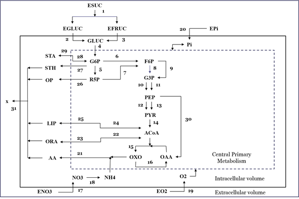 Although this model is used as a case study to present the optimization strategies to maximize metabolite production, such strategies can be generalized for application to models of different plant cell cultures and biotechnological processes. The metabolic pathway considered in the model development is summarized model in Figure 2.