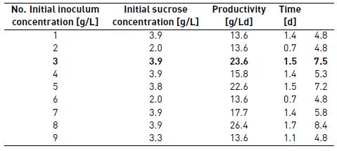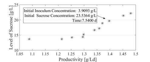 The Pareto front found when solving the problem (stated at (10)-(14)) is shown in Figure 3, and some points are presented also in Table 1. A “Knee” solution can be observed in the region with productivities between 1.4g/Ld and 1.6g/Ld. The selected point, around to the “knee” solution, corresponds to an initial inoculum concentration of 3.9063g/L and initial sucrose concentration of 23.6289g/L to obtain a productivity of 1.5659g/Ld.