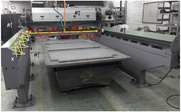 represents the second order polynomial equations of each structure, Wi(gn) is the multiplier, Zi is the analysis point; in Equation (3), Bjnsub(gn) is the summation of the entire section. The points corresponding to the guide of displacement in relation to the axes x, y, z are denoted as gn. In Equation (4), Bjn corresponds to the bodies of the machine. For Equation (5), the unique polynomial for flatness in Z is obtained through PflatZ in relation to x(z) the values respect to the Z axis are evaluated in PflatZ (g1, g2) and it is stored in a matrix.
