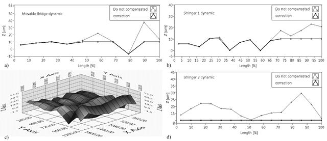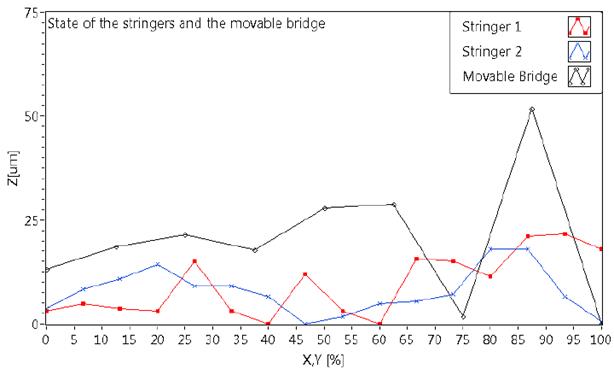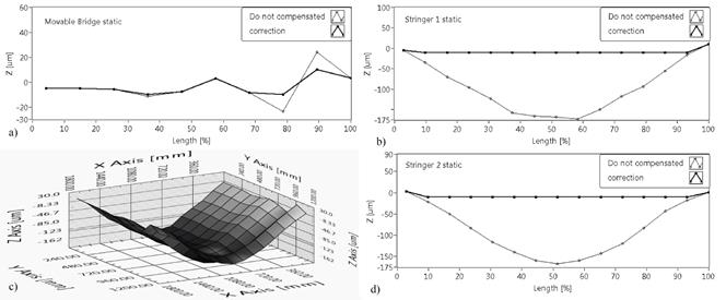 Separately, it is obtained that for the movable bridge the maximum correction performed by the machine is 16±10µm , for the stringer 1, is 171±10µm and for the stringer 2, is 167±10µm. In Figure 11 c, the topology of the machine state is displayed in the workspace (2.16m 2 ) after execution [Figure 6]. Figures 11a, b and c are the views of the stringers and the movable bridge in two dimensions. Each figure shows the correction that the algorithm must have to compensate for the static error.