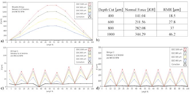 Figure 13 shows the shear depth deflection (SDD) in the machine structure during the depths of the cuts on a) the movable bridge and c) the stringer 1 and d) the stringer 2. In a similar way, Figure 13 b) presents the normal forces generated by the slate in the machine for each cut and the removal rate of material (RMR) in each step is obtained.