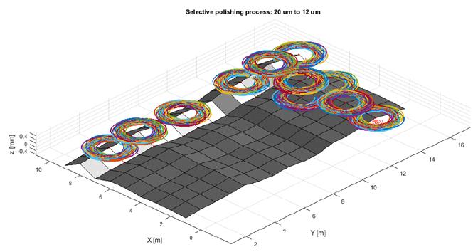 This process is accomplished to 12µm per meter of tolerance with a deviation ± 12µm. The zones where the polishing is performed are observed in Figure 15. The figure also shows the Archimedean trajectory that the polishing tool signed in each work area. The trajectory is based on the parameters established to reduce the flatness range of 12µm to 20µm. This process takes 2.402s per zone worked to remove an error of 8µm thickness. For the same case using the polishing process with linear path (see Figure 6], the work is completed in 4.819s per zone, hence the selective process takes 48.9% of the time that need the polishing process with linear path