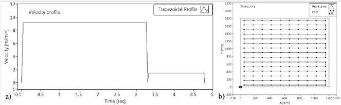 The optimization of the material removal establishes relationships between the translational velocity of the tool and the angular velocity of the spindle, to generate a less trapezoidal velocity profile (see Figure 6a) and maintain the equal removal rate over the entire surface, both in the edge area and also in the middle area as shown in Figure 6. In Figure 6b, the changes in the velocity of the spindle (rpm) in relation to the position of the tool along its path can be seen.