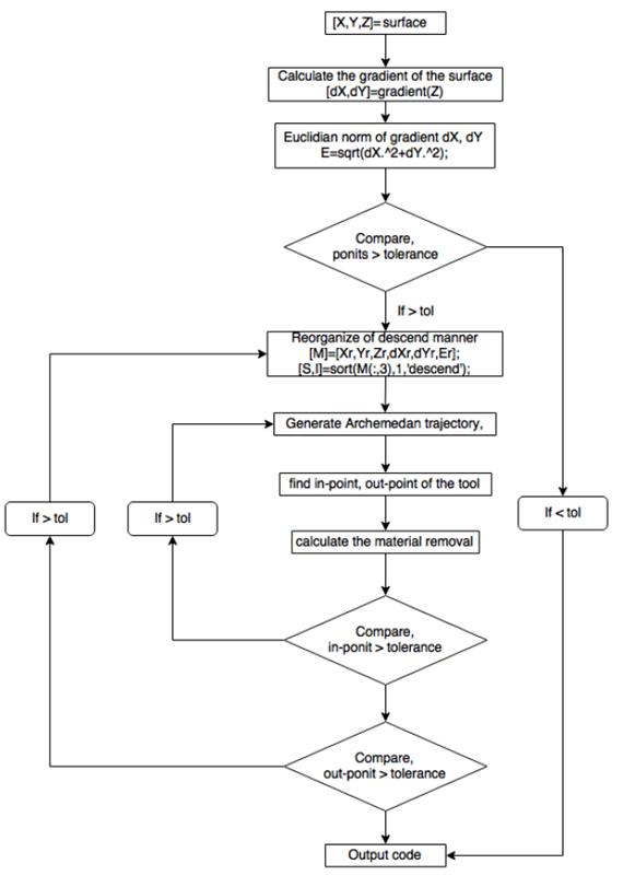 Historically, the polishing process errors were generated by a process performed manually, in which the operator skills were the main parameter [16, 17]. Then, automatic machines and controllers were developed. Preston in 1921, postulated a mathematical model upon the polishing process, based on the material removal rate, according to the relative velocity between the tool and the workpiece, maintaining a constant pressure. It also relates the material mechanical properties of the tool and the lubricating fluid type used in the polishing process. This relationship is known as the primary polishing equation [17-19]. In the 90's, Huisoon [20] presented an experimental study that showed the effects that occurred in the workpiece when varying the configuration of the various polishing parameters using an abrasive disc of steel to determine a certain type of roughness. Liao [16] developed adaptive pressure control to determine when the tool head keeps constant the contact between the tool and the workpiece to ensure the polishing process. Khan [21] presented a mathematical model to estimate the surface residual errors from the operating parameter settings. When the surface has a complex shape, the simple model fails, and the influence function appears [18]. Schinhaerl [19] studied the distribution of material removal in relation to some influence function. Wang [22] developed a prediction model material removal with grinding stones; the relationship between pressure and depth removal is analyzed creating a distinctive profile material removal using Hertzian distribution. Temmler [23] developed an algorithm called selective laser polishing to enhance the surface appearance, through reallocation of material instead of ablation with laser remelting in metallic surfaces. This algorithm is not achieving the flatness and the material is not removed. Algorithm has a great utility to achieve a greater precision in the design of surfaces such as leather textures, automotive panels and the metallic surfaces. In the case of petrous materials, the laser is not useful due to the high energy consumption, so the processes of elimination of material by direct contact must be considered. Hence this algorithm must consider the cutting forces, vibration effects and manufacturing errors that occur at the time that the tool and workpiece are touched.