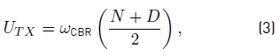 which involves the distance between sender and receiver D, the number of neighbors N of a given node, and the channel busy ratio CBR. D is calculated with Equation (4) expressed as follows: