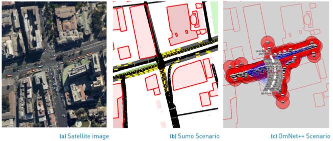 To obtain the baseline results, we employed the intersection illustrated in Figure 1, which is deployed on an intersection of two avenues with high vehicular traffic in the city of Santiago, Chile. The intersection has 3 and 4 lanes per road. The map is set in the SUMO simulator and we introduced vehicles according to 2 different densities: low 15.6 [veh/km/ln] and high 73.4 [veh/km/ln]. The densities seek to replicate representative values within fuzzy sets reported in [44], where the authors classify different vehicular traffic density degrees, according to real measurements carried out in [45]. With the objective to observe the performance at critical levels, we chose the extreme densities (low and high), which are consistent with the density values employed for the protocols under evaluation in their original proposal [13].